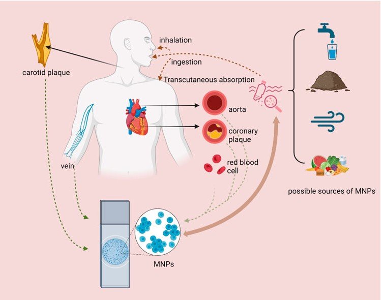 Microplastics are plastic fragments smaller than five millimeters, mostly formed as larger plastics break apart in the environment. They enter our body when we breathe, eat, and drink. Some smaller microplastics, called nanoplastics, are tiny enough to pass through the lungs or gut and enter the bloodstream, where they can travel throughout the body and accumulate around the heart.